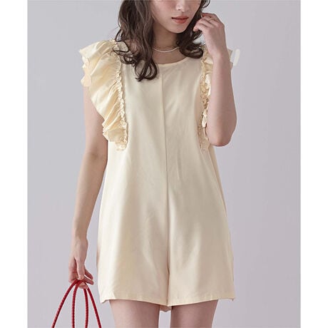 ・ボリュームのあるショルダーフリルデザインが大人可愛いロンパースタイプ水着。