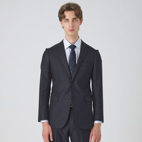 汎用性の高い紺無地素材は、ビジネスからブライダルまで幅広いシーンでご着用いただけます。経糸緯糸共に双糸使いにする事で、しっかりしたハリのある生地に仕上げています。また濃度があるシャークスキン組織のため、秋冬らしい重厚感のある1着に仕上がっています。