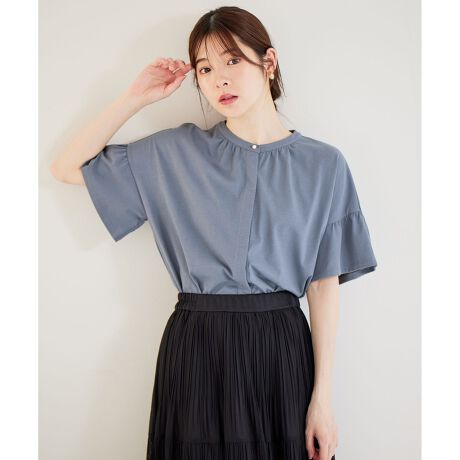バンドカラーのブラウスライクなカットソーです。襟周りに施されたギャザーやふわりと広がる袖のシルエットが女性らしい一着。ジャージー素材なのできちんと見えしつつも着心地が良いのが嬉しいポイントです。また、組み合わせるアイテムによってカジュアルにもきれいめにもスタイリングの出来る万能さが魅力。汗をかいても目立ちにくいので、汗ばむ季節に活躍する優秀トップスとなっています。