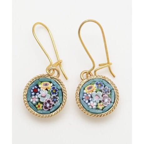 イタリア・フィレンツェの伝統技法「ガラスモザイク」で作られたミニサイズのフックピアス。1mmほどのベネチアンガラス(ムラーノガラス)をフレームにはめ込んで、お花などの模様を表現しています。昔ながらの職人の繊細な技が光ります。身に着けてちょっと嬉しくなるアイテムです。