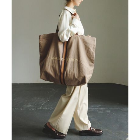 落ち着いたカラーリングで統一した、モダンな雰囲気が漂うビックサイズのトートバッグ。