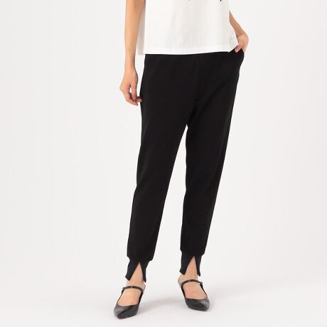 腰周りはゆとりがありつつもすっきりと、裾に向かって細くなるシルエットに加え、落ち感のある素材なので細見え効果が期待できるデザインです。