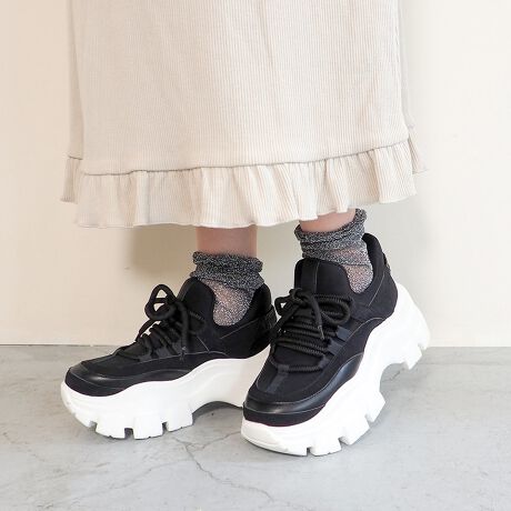 ボリュームたっぷりのダッドスニーカーはモードな雰囲気と女性らしいカラーリングで今っぽく。流行のパフスタイルコーデやY2Kファッションにも◎
