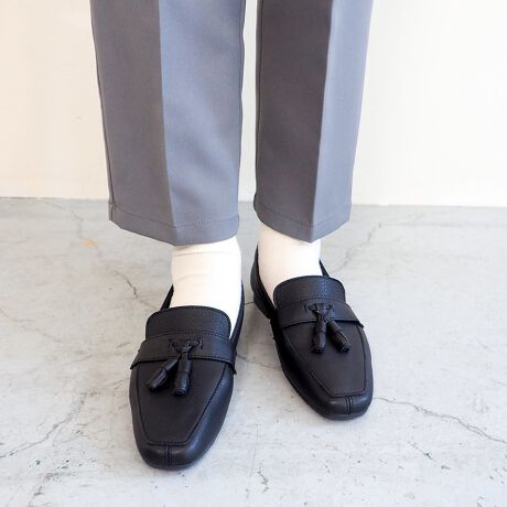スマートなスクエアトゥにタッセルアクセントが映えるソフトローファー。きちんと感のあるすっきりとした見た目はオンにもオフにも幅広く使え、デイリーに活躍してくれそう。