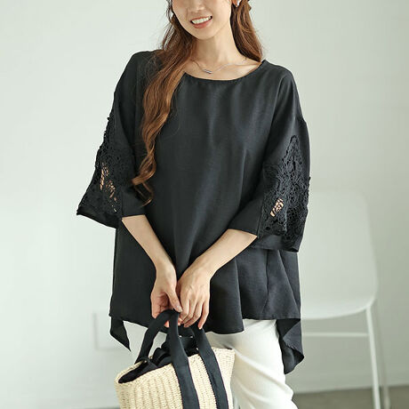 袖のレース切替がフェミニンな印象のプルオーバーの登場です。身幅に余裕をもたせたシルエットで体型を拾わずリラクシングな着心地です。裾には前後差をつけることでスタイリングにこなれ感を漂わせます。シンプルながらもさりげなく着映えすデザインで、カジュアルにもキレイめにも幅広いコーディネートにも活躍してくれるアイテムです。