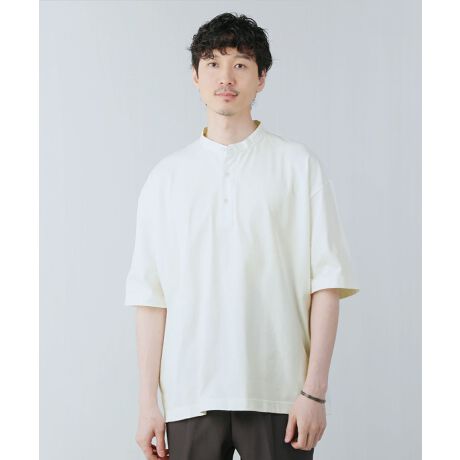 バンドカラーシャツによく似た襟デザインで、Tシャツでありながらもシャツのようなきちんと感も演出してくれるアイテムです。