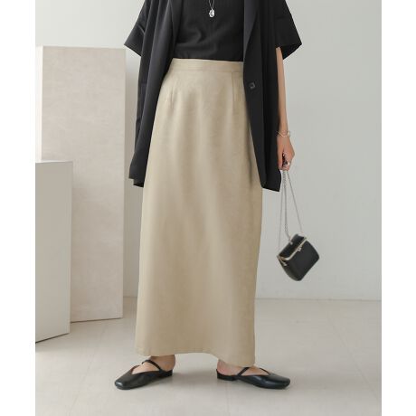 大人っぽいマットサテンで、クールなナロースカートが出来上がりました!シンプルなすっきり見えデザインでお仕事からデイリーユースまで迷わずお召しいただけます。キレイめながら、ウエストは平ゴムとファスナーをオンしてイージーな着脱を可能に。裾にはベンツをあしらい足さばきも良くしました。