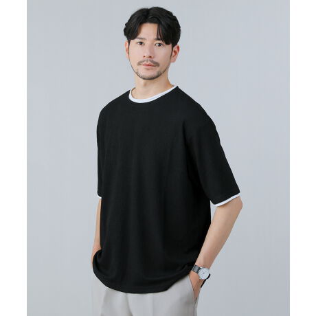 重ね着をしているように見えますが、襟と裾のみ部分的に別布を繋げているため、とても軽やかな着心地です。ゆとりのある身幅とドロップショルダーで作り出したオーバーサイズ感がトレンドライクな抜け感を演出。適度な伸縮性も備わっているので窮屈感や暑苦しさを感じさせません。