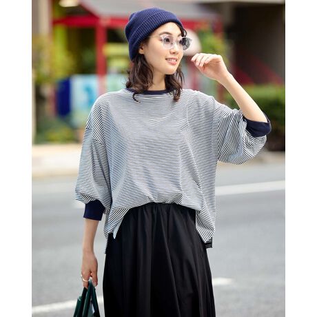 オーガニックコットン100%の天竺を使用したミジンボーダーのTシャツです。袖にボリュームを持たせて、袖を上げて着てもバランスよく見えるデザインにしました。袖と襟の引き締め配色カラーもポイントです。