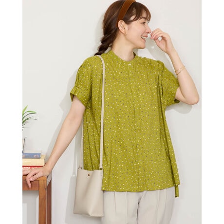 ほどよい光沢と落ち感のある綿レーヨンの素材を使用。肩からなだらかに繋がるフレンチスリーブの袖口に施したタックが、えめに広がる可愛らしいブラウス。襟はタイトなバンドカラーに設定し腕と首の肌露出に強弱を付け、品良く見えるように意識しました。前立てはヒヨク仕立てにし、きちんとした雰囲気を強めています。ドットが変形したプリントは2色で構成し、モダンながらも親しみやすい柄になりました。外出が楽しくなる1着です。