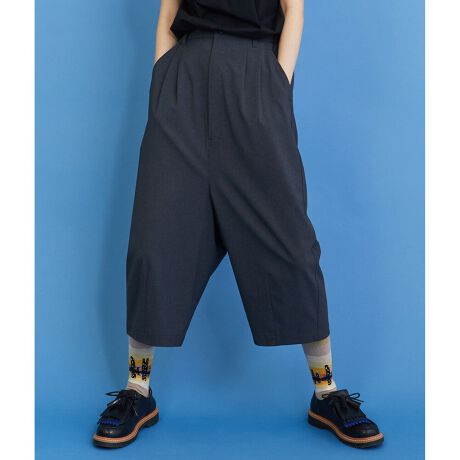フロントはタックでしっかりとした見え方を出しながらも、股下の深さや裾にとったダーツで程良いテーパードが効いたシルエットはキレイな素材のドレープ感で大人見えのするモードな雰囲気に仕上がっています。