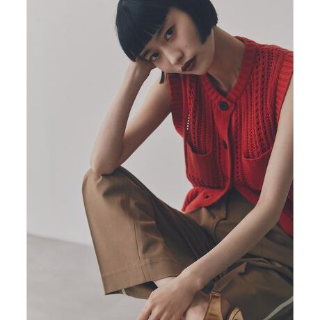 [型番:1664270852]透かし編みに配色ボタン、ポケットディテールがアクセントになったクルーネックのニットベスト。透かし模様のある編地なので、お持ちのインナーを合わせていただき、ボトムスはフェミニンなスカート、カジュアルなデニムパンツ、マニッシュなパンツを合わせ、雰囲気を変えたコーディネートを楽しめます。長すぎず、短すぎない丈感なので、アウトスタイルをバランス良く引き立てます。