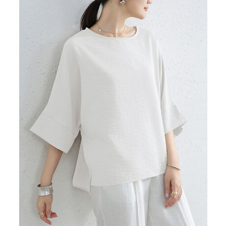ドルマンスリーブで二の腕をさりげなくカバーしつつ、夏でも快適な着心地のカットソー