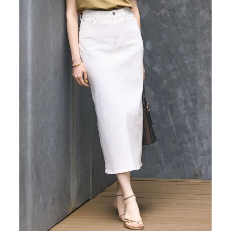 ウエストからミドルヒップまで体のラインを程よくマークしたAラインのデニムスカート。ストレッチ性のあるポケット袋布を使用しているのでウエストがきれいにフィットします。スリットも入っていて、素材の軽さもあり足捌きもよい穿き心地です。 ポケットの裏地部分に23区DENIMオリジナルプリントを施しています。カラーは明るめのスカイブルー(#073)と、きれいめにも着こなせるネイビー(#075)、一度洗いをかけたような新色のウォッシュドブルー(#074)の3色に新色の清涼感のあるホワイト(#001)を加えた4色展開です。