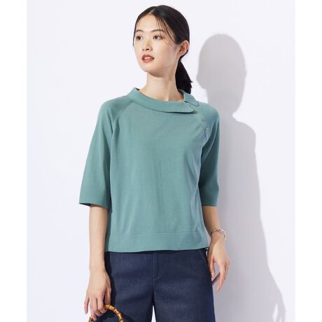 襟と金縁の釦で顔まわりを華やかに!適度な伸縮性と清涼感のあるニット