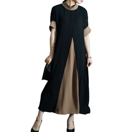 【ワンピース】 配色 バイカラー 半袖 ロング丈 スタンドネック ドルマン ボタン ブラック 黒 夏