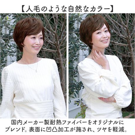 【急なお出かけ前も簡単装着】毛染めまで待てない時に!「プレミアム白髪かくしウィッグ ナチュラルショート」。【手軽に使えるクリップタイプ】ウィッグをブラッシングし、カバーしたい部分に乗せてクリップで固定するだけ。【頭皮に優しくストレスフリー】裏側には頭皮に優しい、柔らかなネットを使用。肌を傷つけることなく快適な着用感。【頭皮の質感を表現した自然なつむじ】医療用ウィッグにも使用される、ごく薄いシルクスキン。真上からの視線も気にせず安心。【前髪の自然な立ち上がりを再現】前髪の生え際に手植えを施しているから、毛の立ち上がりがナチュラル。【ウィッグ特有の重さを軽減】量感を調整した軽やかな質感。自毛に馴染みやすいレイヤーがポイント。【しっかりカバー&ボリュームアップ】つむじ・分け目を広範囲にカバー。自然なボリュームアップも同時に叶うのが嬉しい♪【エイジレスに使えて万能】オールマイティなショートスタイル。産後の髪の悩みにも対応。【人毛のような自然なカラー】国内メーカー製耐熱ファイバーをオリジナルにブレンド。表面に凹凸加工が施され、ツヤを軽減。【ヘアアイロンなどの使用も自由に】耐熱性があるので、コテやヘアアイロンの使用も可能。(※)耐熱温度は180度、適正温度は130〜150度です。【自宅でお手入れできて衛生的】絡みや汚れが気になったら手洗いできるから、いつも清潔をキープ。【ウィッグ初心者さんでも安心】着用ポイントやお手入れ方法が書かれた説明書付き。