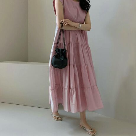 肩まわりを華奢に見せてくれるフレンチスリーブと、ティアードデザインで体形カバーにもおすすめです。<br>