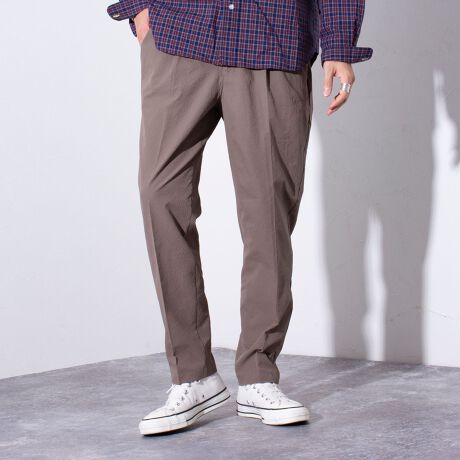 ウエストにはゴム、ベルトループをそれぞれ採用し、イージーパンツの様なリラックスした着用からベルトを使ったトップスインの着こなしまで、幅広く対応可能。