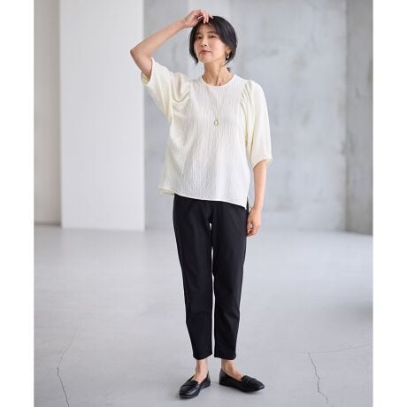 デザイン・ピタッとしすぎない程よいサイズ感とストレッチ素材が、ストレスフリーで着用できる・ウエストはゴム仕様でリラックス感があり、内側の紐でサイズ調整が可能・ウエストの後ろがゴム仕様になっているため穿き心地抜群