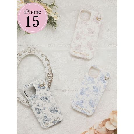 淡いカラーリングのトワルドジュイ柄が大人可愛いiPhone15ケース。お花とリボンを描いたMaison de FLEURらしいデザインです。