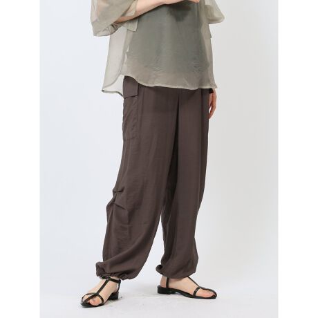 腰回りや太ももはゆとりがあり、裾に向かってやや細くなるシルエットです。裾部分のドローコードを調節することで着こなしの変化を楽しめます。足元はヒールパンプスで引き締めると、脚長に見えてスタイルUP効果があります。