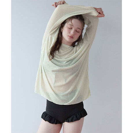 ・ウォッシャブルレーヨン混の柔らかい肌触りのシアーリブ素材ラッシュガードトップス付き3点セット水着。