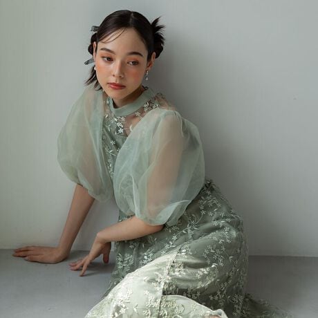 オーガンジー素材のボリュームパフスリーブが印象的で、