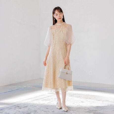 オーガンジーパフスリーブ フラワー刺繍レースドレス