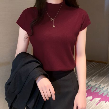 ハイネックが大人の女性の品格を演出し、オフィスカジュアルにも重宝。