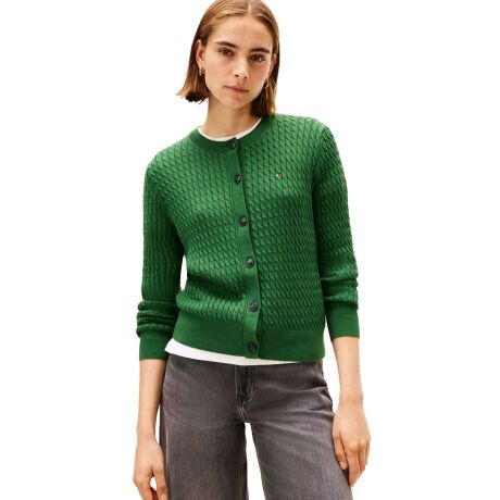 装いに柔和な品のよさが加わるミニケーブル編みのクルーネックカーディガン。左胸にはブランドを印象づけるフラッグロゴ刺しゅうが施されています。着回しが効くベーシックなデザインと仕立てで、オンオフ問わずタイムレスに活躍。長いシーズン着用できる程よい厚みのコットンニットを使用しました。