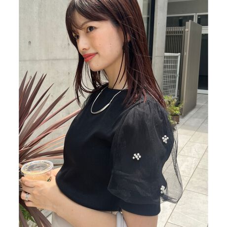 パール×チュールスリーブが目を惹くフェニミニンカットトップス。