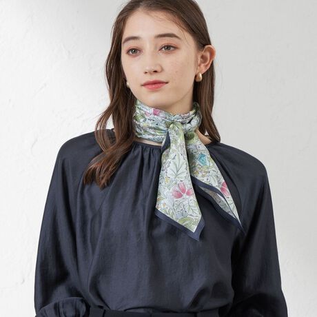 イングリッシュガーデンをイメージして描かれたスカーフです。美しく咲きく花やフレッシュな葉、世界平和を願い幸せを呼ぶ青い鳥と平和の象徴の鳩を描きました。シンプルトップスに映えるプリントスカーフでコーディネートをおたのしみいただけます。