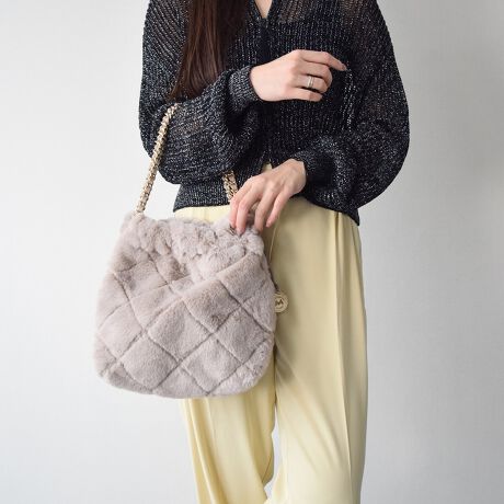 フェイクファーの素材感とチェーンハンドルがフェミニンで大人っぽい印象のハンドバッグです。
