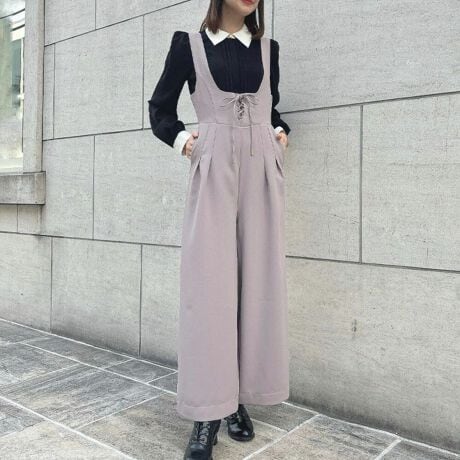 コルセットのような深めの襟ぐりがクラシカルな印象のサロペットパンツ。