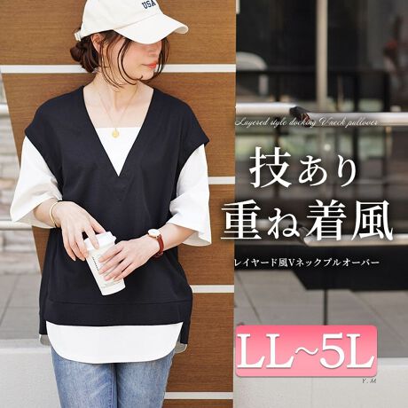 着るだけでコーデ完成!レイヤード風ドッキングプルオーバーの登場です。オーバーサイズのTシャツでゆったりとリラクシングな着心地です。深めのVネックベストをレイヤードしたデザインでスッキリした印象に☆裾の切り替えで着痩せ効果も◎ヒップは隠れる長すぎない丈感で合わせるボトムも選ばずコーデが楽しめます。1枚でコーデが決まるので1枚あるとワードローブが潤うこと間違いなし☆