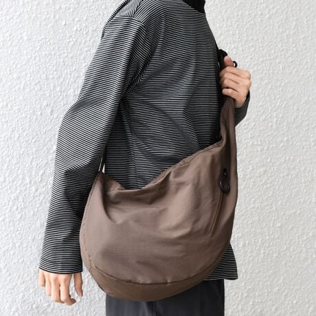体のラインにしっくり馴染む三日月型のショルダーバックで、マチ部分には図形を組み合わせたSHIPS anyのロゴが刺繍されています。