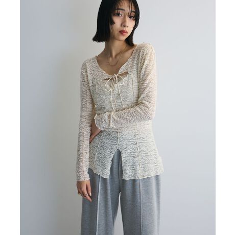 カットワークデザインレースでレディライクに仕上げたトップス。ネックに施されたリボンも愛らしい表情をプラスするアクセントに。アウトシームの切替もスタイリングにメリハリ感を演出してくれます。旬のシアー感のあるアイテムは、ワードローブに是非取り入れたい1着です。▼Design Point・伸縮性のあるレースを使用しており、肌触りが良く、上品な印象を与えます。・フロントに付いた紐を結んでリボンデザインにすることで、女性らしさをプラス。カジュアルにもフェミニンにもアレンジが可能です。・フロント部分のデザインカットが個性的で、シンプルな中にもこだわりを感じさせます。さりげないおしゃれを楽しむことができます。・裾部分のスリットが動きやすさを確保し、アクティブなシーンでも快適に着用できます。デイリー使いにもぴったりです。透け感[有り] 裏地[無し] 伸縮性[有り] 光沢感[無し] 生地の厚さ[薄手] 付属品[無し] ポケット[無し]■AnriettMusee 手が届く上質、都会のエレガンス 忙しく日々を過ごす大人の女性たちが求めるのは、自分らしいスタイルを引き立てる”シンプルだけどデザイン性のあるアイテム 「AnriettMusee(アンリエットミュゼ)」は、そんな女性のニーズにお応えするプランドです。1点取り入れるだけで毎日のコーディネートにアクセントが加わるお手ごろで高品質なアイテムをお届けします。 フランスのエレガントなカルチャーを取り入れたシンプルでありながら洗練されたコーディネートで、毎日の生活やお仕事、そして特別な日などの女性たちの日常に「小さな特別感」をプラスします。【ご注意事項】※サンプルにて撮影を行っております。実際にお届けする商品と仕様やサイズが異なる場合がございます。