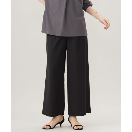 ■デザイン1タック入りでトレンド感を演出するワイドパンツ。前のタブと釦ディテールが、トップスをインした時のアクセントになります。前にタックが入っていることで分量感が出て、腰まわりにゆとりがあるので、気になるヒップまわりも気にせず楽な穿き心地です。後ろウエスト部分にゴムを入れて伸縮性をもたせているため、楽に着脱できます。パンツにボリュームがあるので、コンパクトなトップスと合わせるのがおすすめ。カラーは、合わせるアイテムを選ばないグレー(#003)、ベーシックで大人なブラック(#005)、柔らかな雰囲気がフェミニンなモカ(#030)の3色で展開します。
