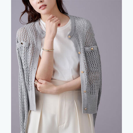 ゴールド釦がアクセントの透かし編みカーディガン。