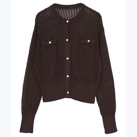 ゴールド釦がアクセントの透かし編みカーディガン。