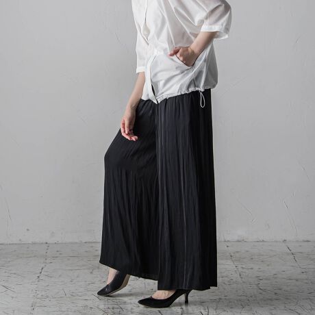パウダータッチで優しいタッチが特徴の割繊素材を使用したギャザーワイドパンツ。