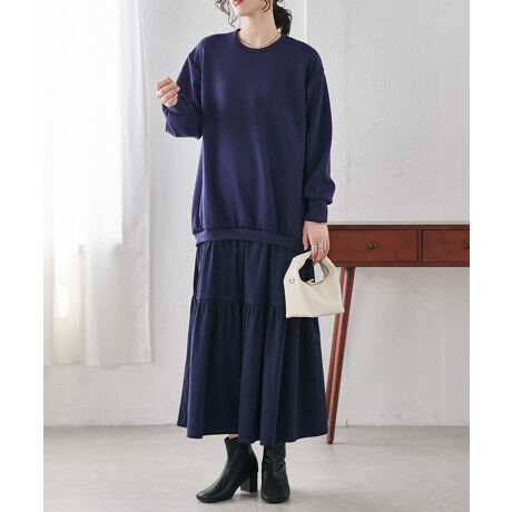 ・きれいめスウェットとティアードスカートをドッキングしたデザインのワンピース。