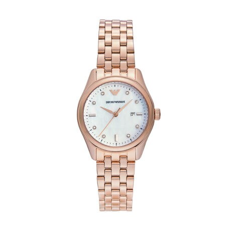 32mm径のケースにデイト表示付き三針ムーブメントを搭載したEmporio Armaniのウォッチ。ホワイトマザーオブパールのダイヤルに、ローズゴールドトーンのステンレススチールブレスレットを組み合わせました。