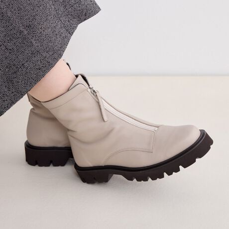 これはフロントジップで脱ぎ履きしやすいです。革も艶消しで柔らかく上質感があります。厚底も程よく軽いです。甲高なのでワンサイズ上を購入したのですが甲部分がファスナー上げにくいです。キツい。つま先はガッツリ余ってるので細身なのかも知れません。本革でフロントジップ、このサイズとなるとなかなか難しいので返品せずたくさん履きます!