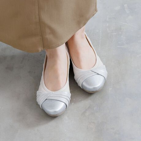 クリア箔加工を施した上品なプリーツリボンが大人な雰囲気に。中底全体に入った低反発クッションが足にフィットし、長時間の歩行でも楽に履いていただけます。