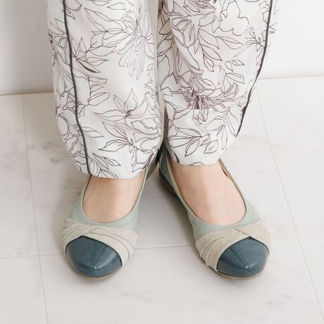 クリア箔加工を施した上品なプリーツリボンが大人な雰囲気に。中底全体に入った低反発クッションが足にフィットし、長時間の歩行でも楽に履いていただけます。