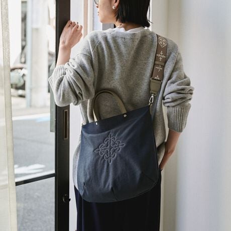 知的で引き締まったネイビーは、オン・オフ問わず使いやすいカラー。刺繍は控えめに映え、配色ショルダーが重さを感じさせないバランスに仕上げています。