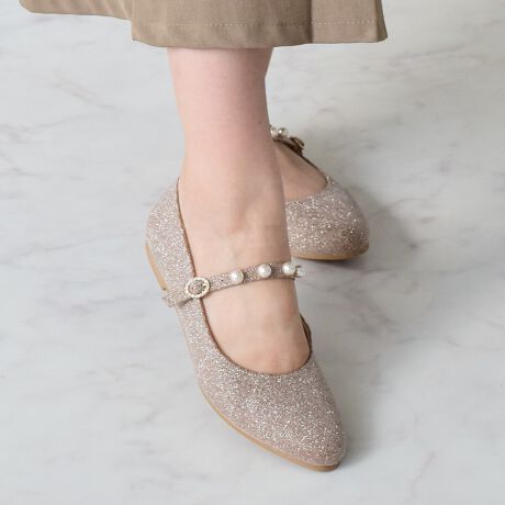 ストラップにパールの付いたメリージェーンデザインのフラットシューズ。ひっかけ金具にもさりげなくビジューがあしらわれておりレディーライクな印象に。ストラップ付きで足にフィットしデイリーに履いていただけるパンプスです。