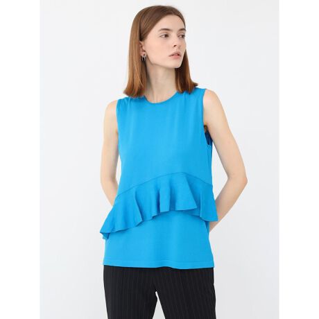 ウエストにアシンメトリーラインでフリルを配置したデザインニット。立体的なフリルが女性らしさを引き立てながら、薄手な肉感と素材の持つしなやかさとが合わさることでボリュームを抑えた大人上品な印象に。お手持ちのワードローブに合わせやすいカラー展開も着用を後押し、シンプルなスタイリングもサマ見えする一枚です。